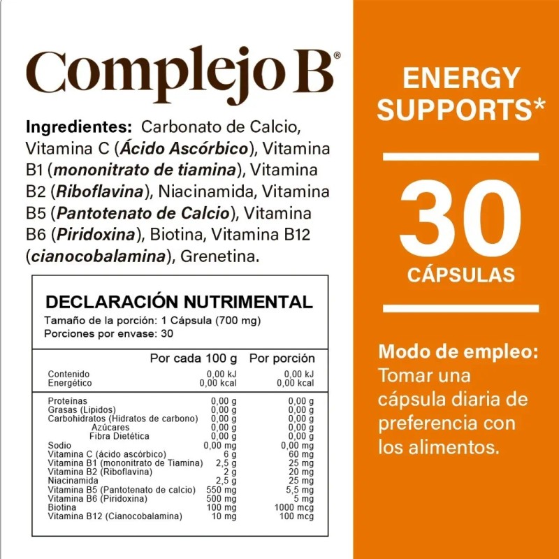 - 500mg de Complejo B: Concentración óptima de vitaminas del grupo B por cápsula.