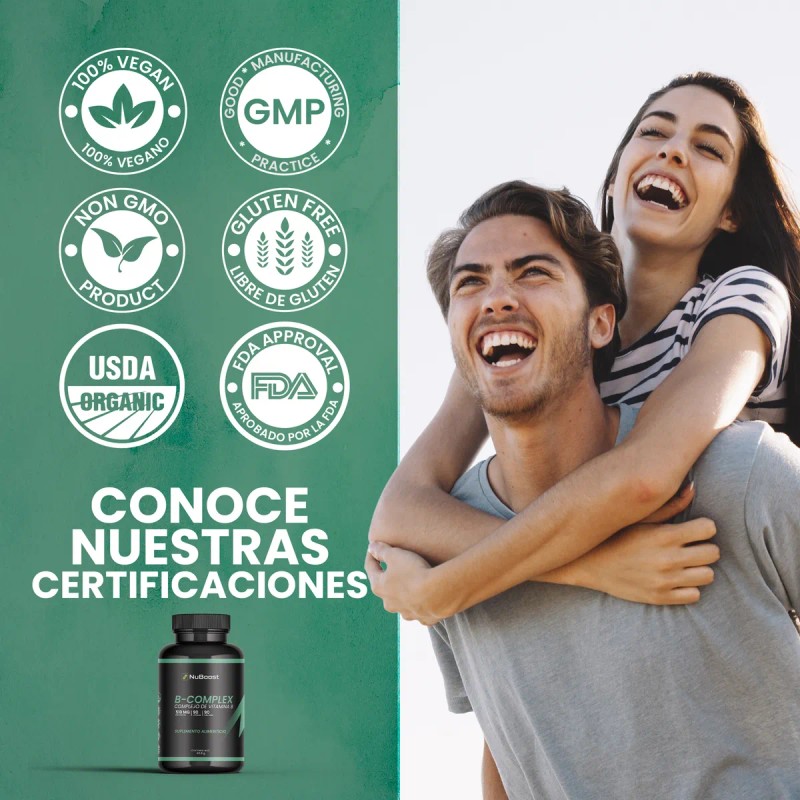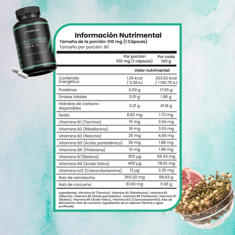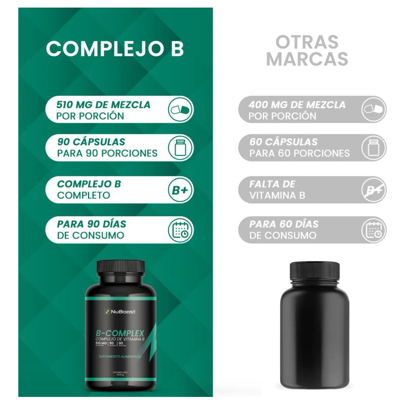 Obtén 510 mg de suplemento b-complex tomando 1 sola cápsula al día. Cada frasco te ofrece 90 cápsulas de suplemento B-Complex NuBoost
