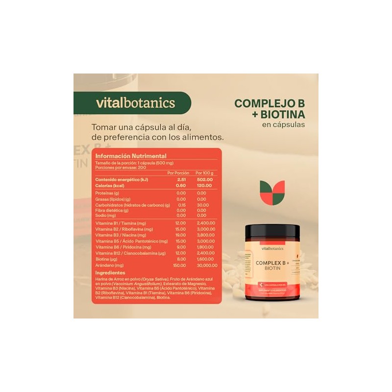- Ingredientes | Vitaminas Complejo B con B1, B2, B3, B5, B6, B12, Biotina y Arándano. 200 capsulas de 500mg (Más de 6 meses). Suplemento Multivitamínico con Vitaminas.