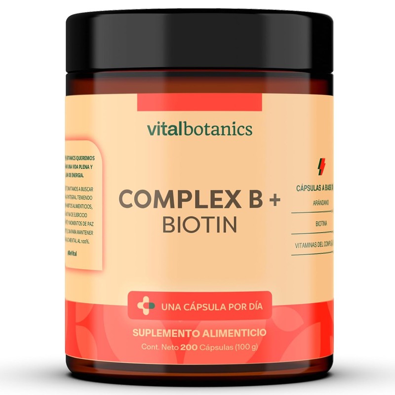 Complejo B con Vitaminas B1 B2 B3 B5 B6 B12 Biotina Niacina y Arándano - 200 Cápsulas de 500mg - Más de 6 Meses - Suplemento Multivitamínico Libre de Gluten y Aditivos - VitalBotanics