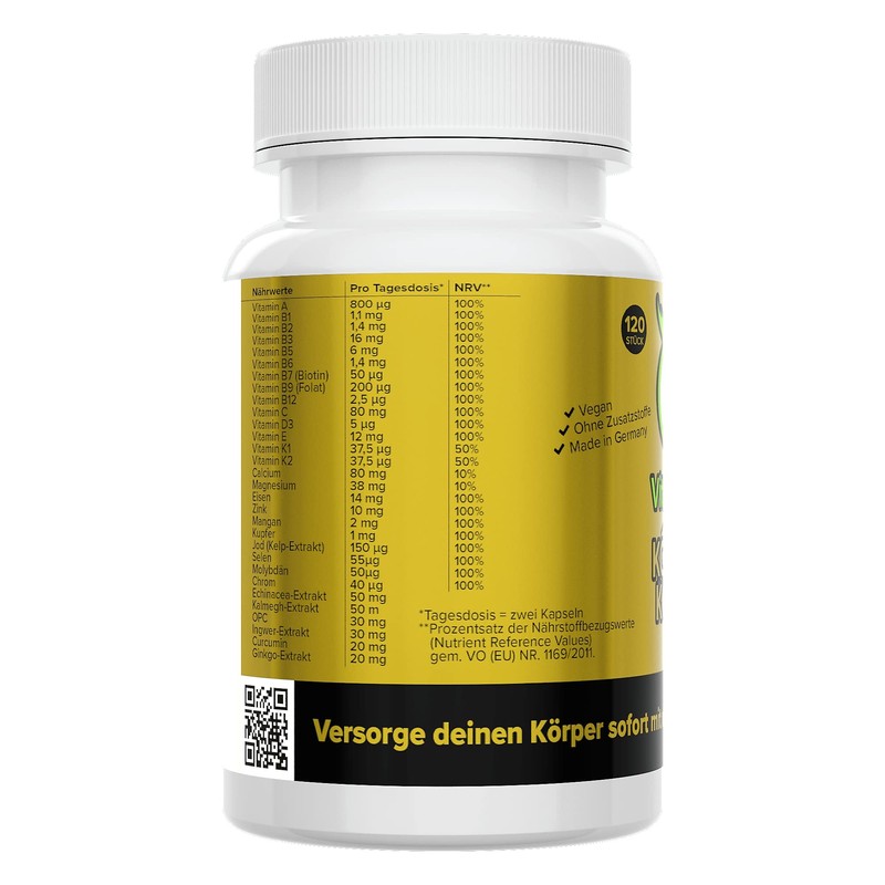 - Sensibly dosed and quick effect – two capsules cover your complete daily requirement for all vitamins, important minerals and superfoods: vitamin A, vitamin B1, vitamin B2, vitamin B3, vitamin B5, vitamin B6, vitamin B12, vitamin C, vitamin D3, vitamin E, vitamin K1 & K2, niacin, folic acid, biotin, calcium, magnesium ink, manganese, copper, iodine, selenium, molybdenum, chromium, echinacea, kalmegh, OPC, ginger, curcumin & ginkgo extract. See the product images for more details.