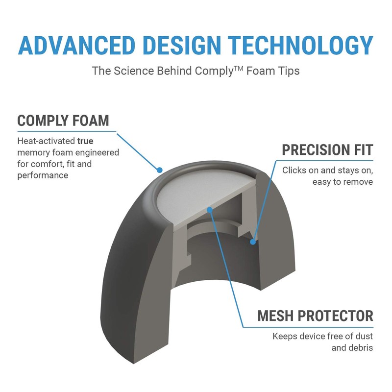 - [COMPLY FOAM TIPS 20 FOR JABRA 75t/65t] New and improved ultra-soft memory foam tips for Jabra 75t/65t that softly expand in your ear for an all-day secure and comfortable fit Have peace of mind also knowing your tip is on securely on your device with one little click