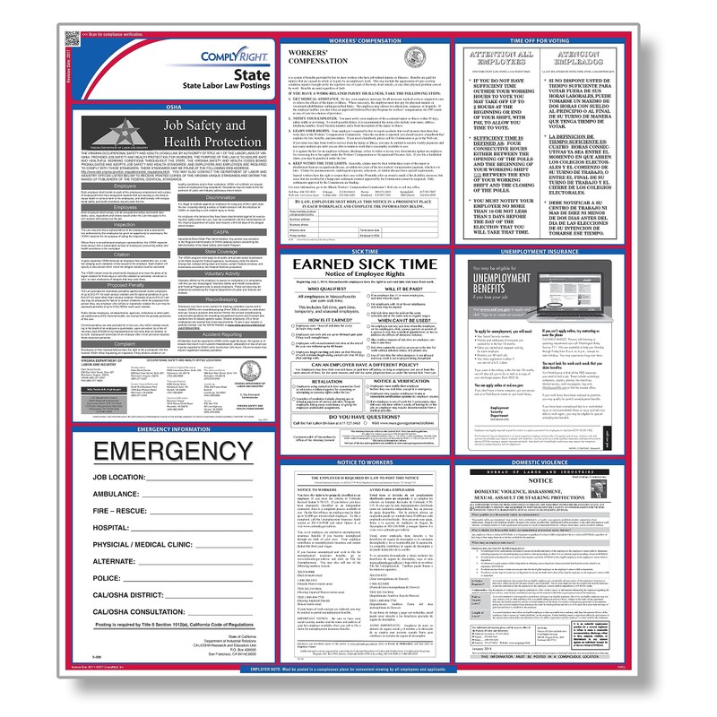 - State poster provides worry-free compliance for every location. Convenient all-in-one design makes meeting posting regulations hassle free. Laminated 24"W x 24"H.