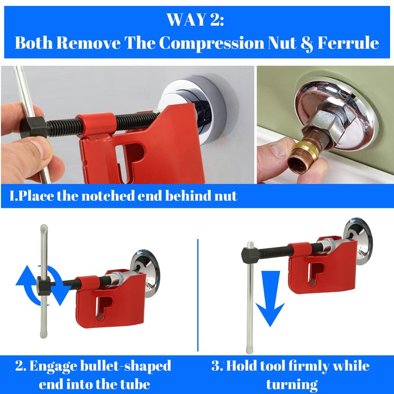 - 【Operating Steps】-- Method 1: This ferrule puller for disassembling sleeve only --- Place the sleeve between the red notched end of the tool (notch clamps the sleeve). Method 2: Remove the compression nut and sleeve --- Place the red notched end of the compression sleeve puller behind the compression nut. Ensure the compression sleeve puller aligns correctly with the pipe, then rotate the handle approximately 10-15 turns to remove the nut and sleeve.