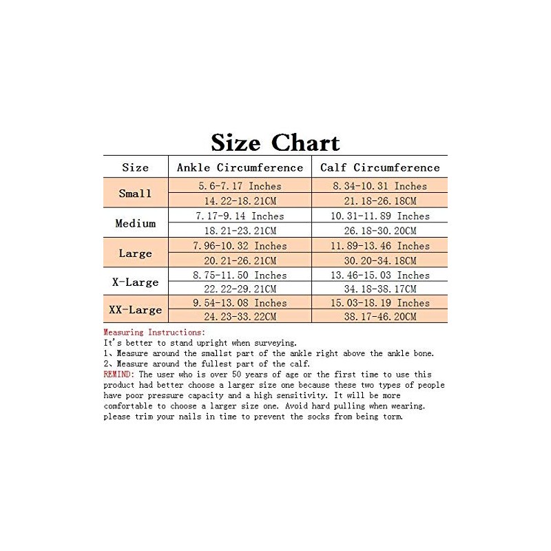 - You can refer to the size chart to choose the suitable size. We do recommend measuring your calf circumference. If your measurements are between sizes, go to a bigger size.