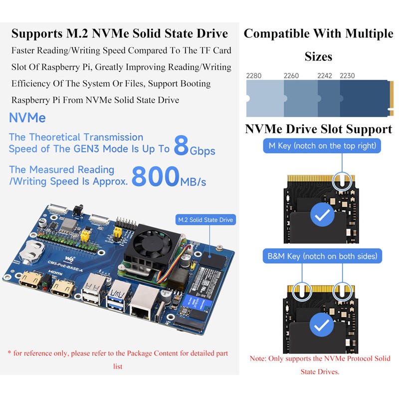• Supports M.2 NVMe Solid State Drive, Faster reading/writing speed compared to the TF card slot of Compute Module 5, greatly improving reading/writing efficiency of the system or files, support booting Compute Module 5 from NVMe Solid State Drive, Compatible with 2280 2260 2242 2230 SSD