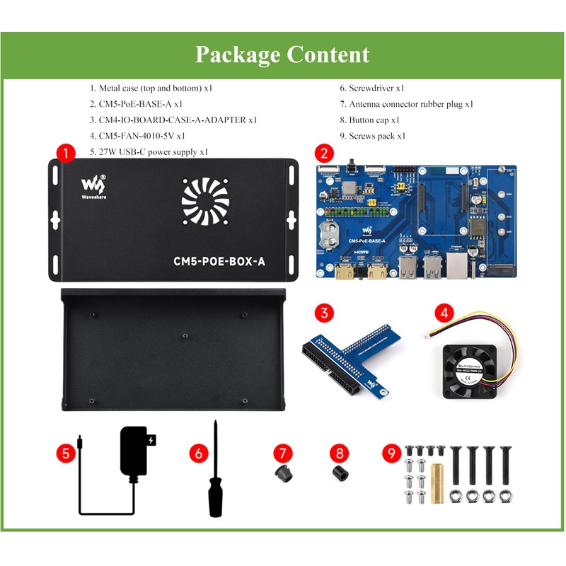 Compute Module 5 Mini-Computer Kit with Compute Module 5 IO Board with PoE Feature + Metal Case + Power Supply Adapter+ CM5 Fan, Compatible with Raspberry Pi Compute Module 5 Lite/eMMC (9 Items)