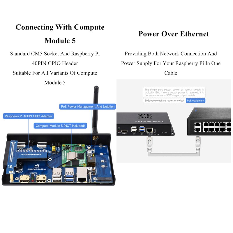 • This is Compute Module 5 Mini-Computer Kit with Compute Module 5 IO Board with PoE Feature + Metal Case + Power Supply Adapter+ CM5 Fan, Compatible with Raspberry Pi Compute Module 5 Lite/eMMC. Suitable for evaluating the Compute Module 5 or being integrated into end products