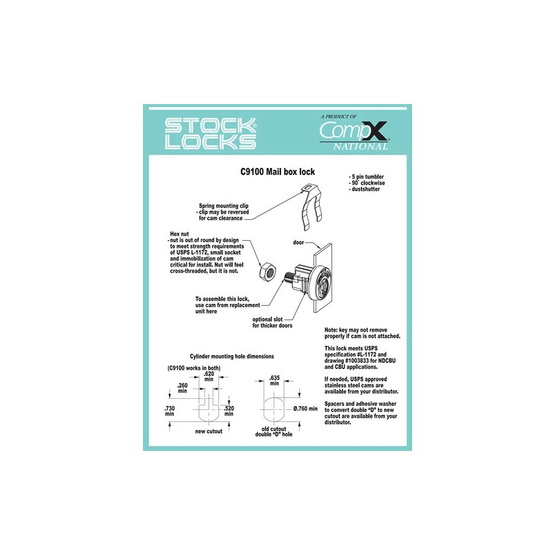 • This lock meets USPS specification #L-1172 and drawing #1003833 for NDCBU and CBU applications