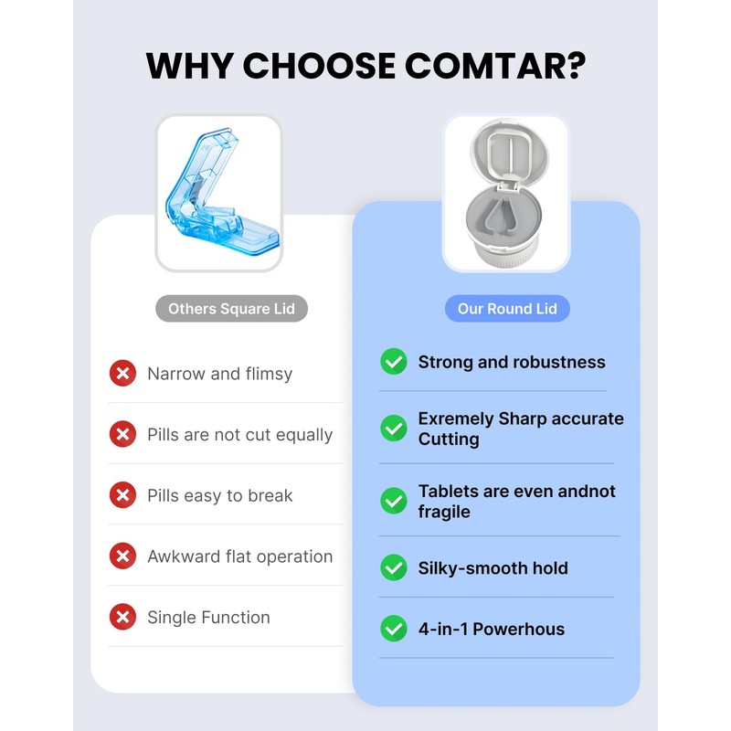 COMTAR COMTAR 4-in-1 Pill Cutter with Crusher, Storage & Cups - Precise Cutting for 0.85in Pills, Stainless Steel Blade, Ergonomic Design (Gray)