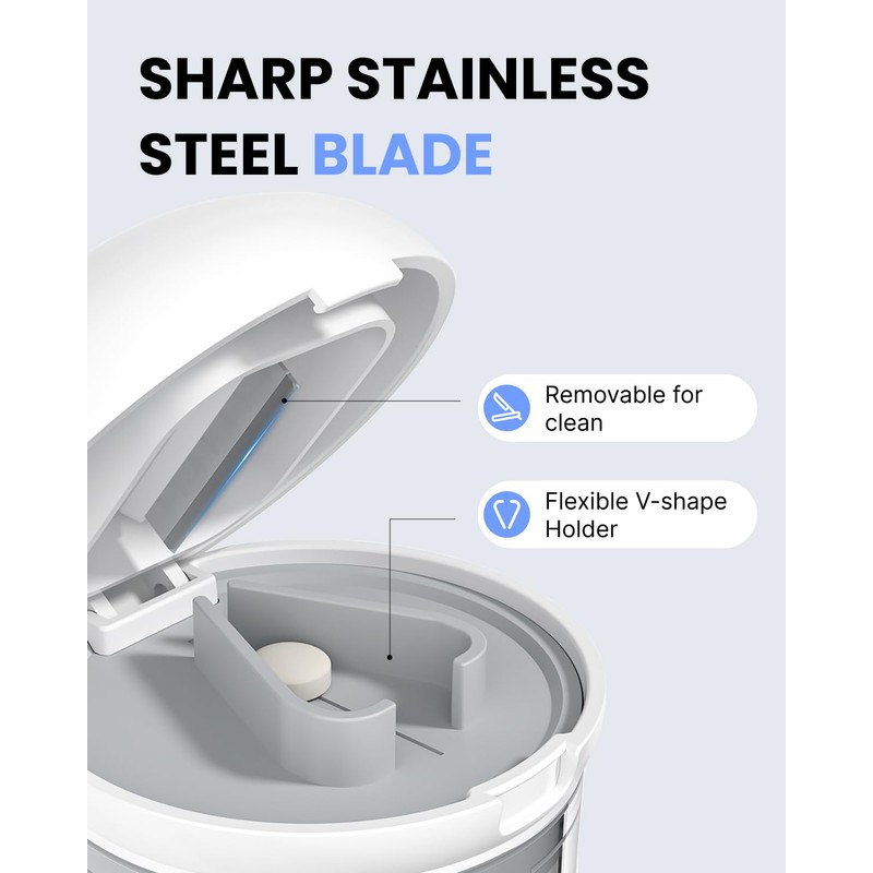 - Precision Cutting for All Pills: Cuts pills from tiny to 0.85in large with secure grip, splits into 1/2, 1/4, or 1/8 doses. Ultra-sharp stainless steel blade ensures clean, precise cuts every time.