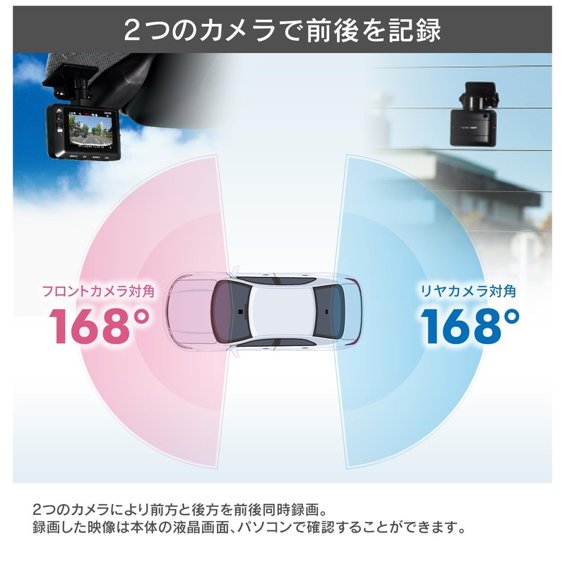 - Front camera specifications: Image sensor: 1/2.8 type CMOS sensor (equipped with STARVIS technology); Number of effective pixels: Up to 2 million pixels; Lens angle: Horizontal 138°, Vertical 70° (diagonal 168°); F value: 1.8; Lens material: Glass