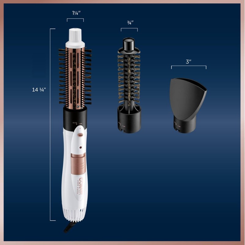 - Hot Air Brush Combo Kit: With 1000 watts of power, this hot air brush features a 1¼ inch thermal brush to curl or straighten, a ¾ inch nylon plus boar bristle brush to curl, and concentrator for silky-straight results.