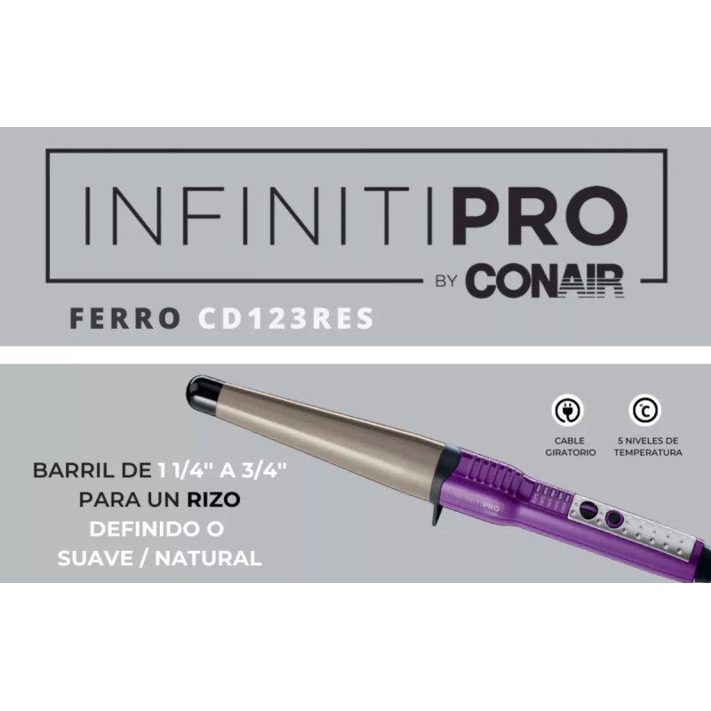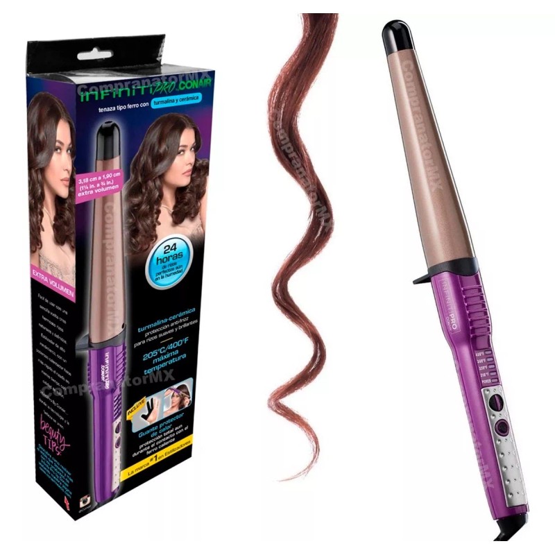 Tenaza Rizadora de Conair InfinitiPro con ferro cónico de 1.9 cm a 3.18 cm (ó 3/4" a 1 1/4" pulgada) de diámetro con tecnología de cerámica y turmalina que mantiene constante el calor para un rizado rápido, de larga duración y permite una distribución eficiente del calor, reduciendo el tiempo de estilizado y brindando máxima protección al cabello por el daño debido a la exposición al calor. Logra unos rizos de hasta 24 horas.
