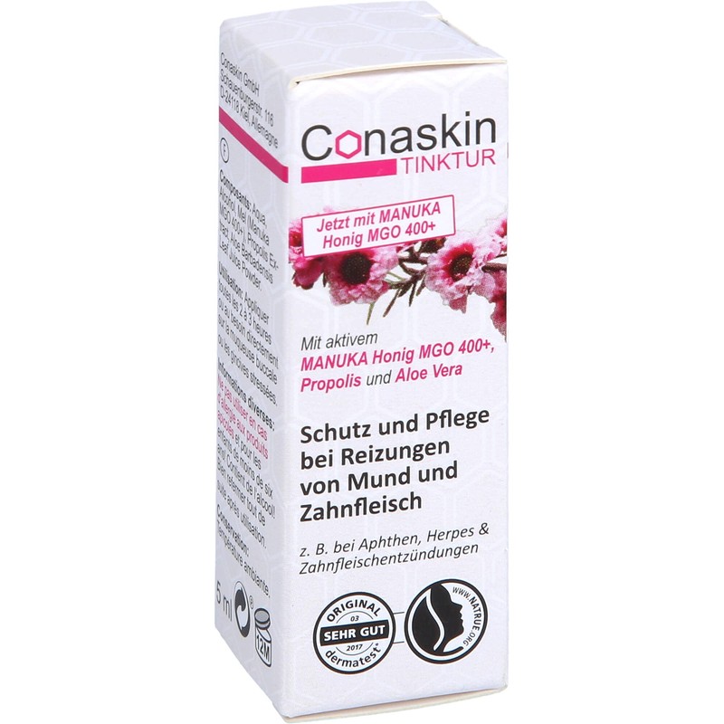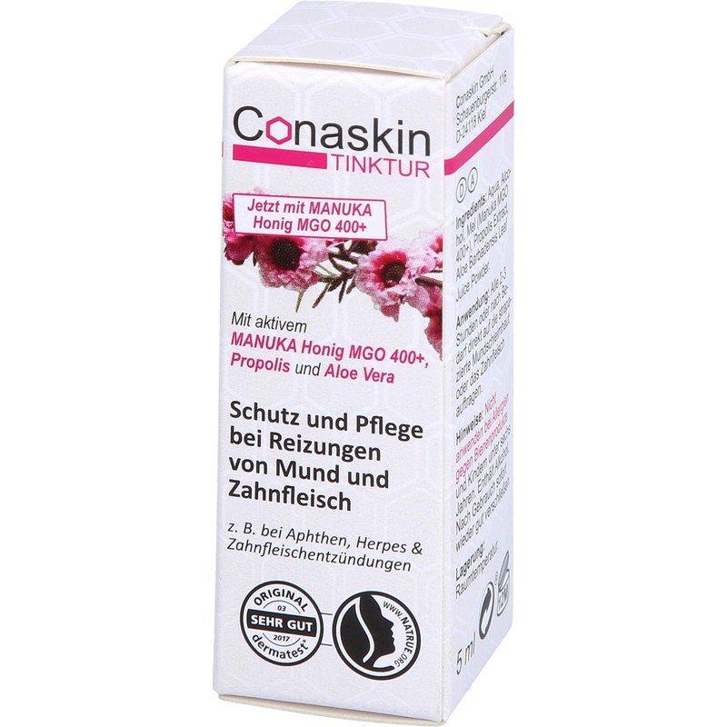 Conaskin Tinktur enth�lt eine einzigartige, patentierte Kombination aus hochwertigem Manuka-Honig MGO 400+, Propolis & Aloe Vera und bietet Schutz und Pflege bei Mund- und Zahnfleischreizungen: