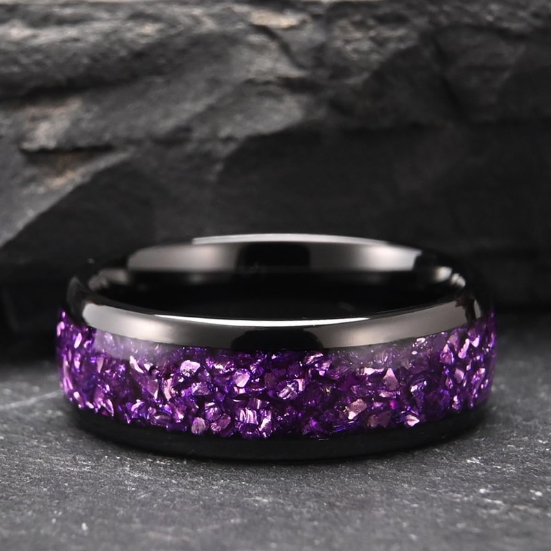 ★ Product introduction: The ring is made of tungsten carbide, with sizes ranging from 7mm to 13mm, and widths of 8mm and 4mm. The black ring is inlaid with amethyst, which is fashionable and charming, not easy to wear and fade. The ring is polished as a whole and fits comfortably.