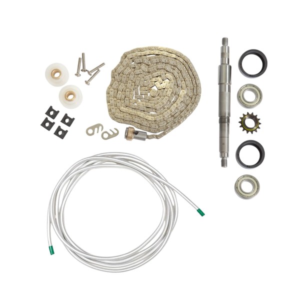 • Includes 14 tooth quiet sprocket, axle, chain idler pulley, nickel chain with connectors and swivel, shock cord, 17mm bearing, 17mm bearing cup, screws and nuts