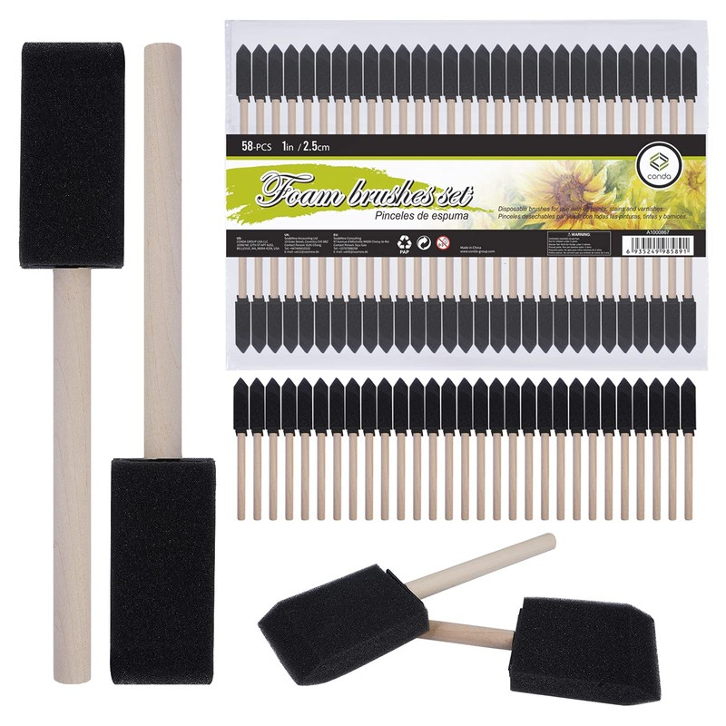 Conda 58 Pack 1" Assorted Foam Brush Set Wood Handle Paint Brush Set- Lightweight, Durable, Great for Acrylics, Stains, Varnishes, Crafts