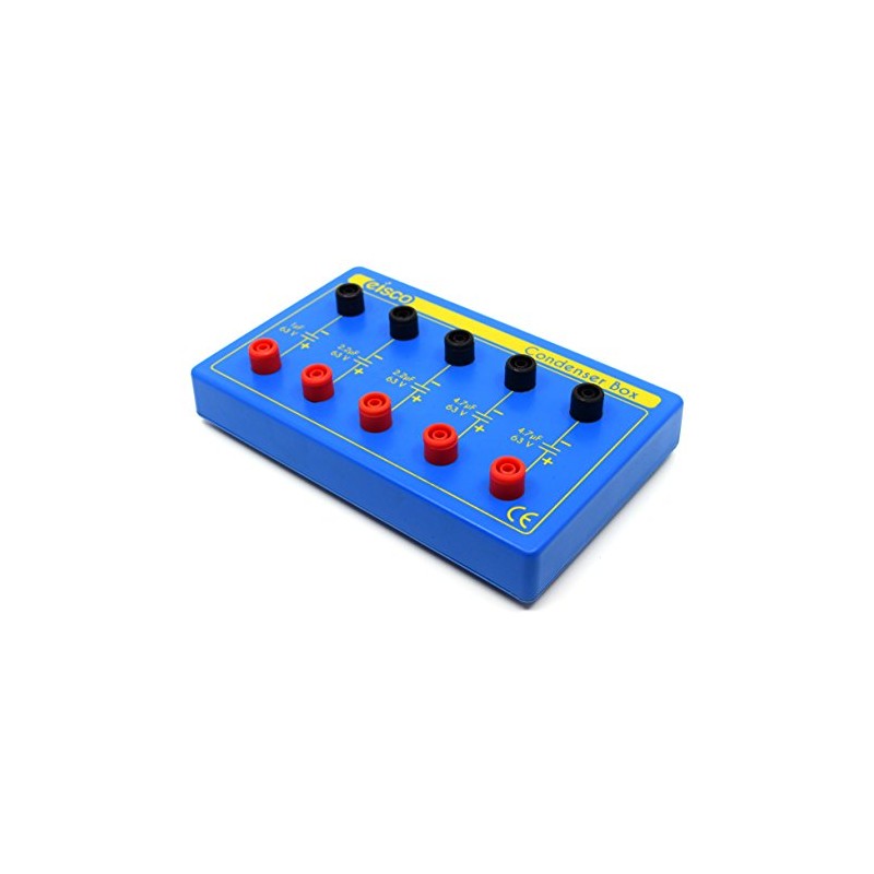 Condenser box featuring five capacitators - 1µF, 2.2µF, 2.2µF, 4.7µF, 4.7µF. 63 volts. Useful for classroom demonstration and study of electricity. Box measures 8" wide, 5" long and 1.5" tall.