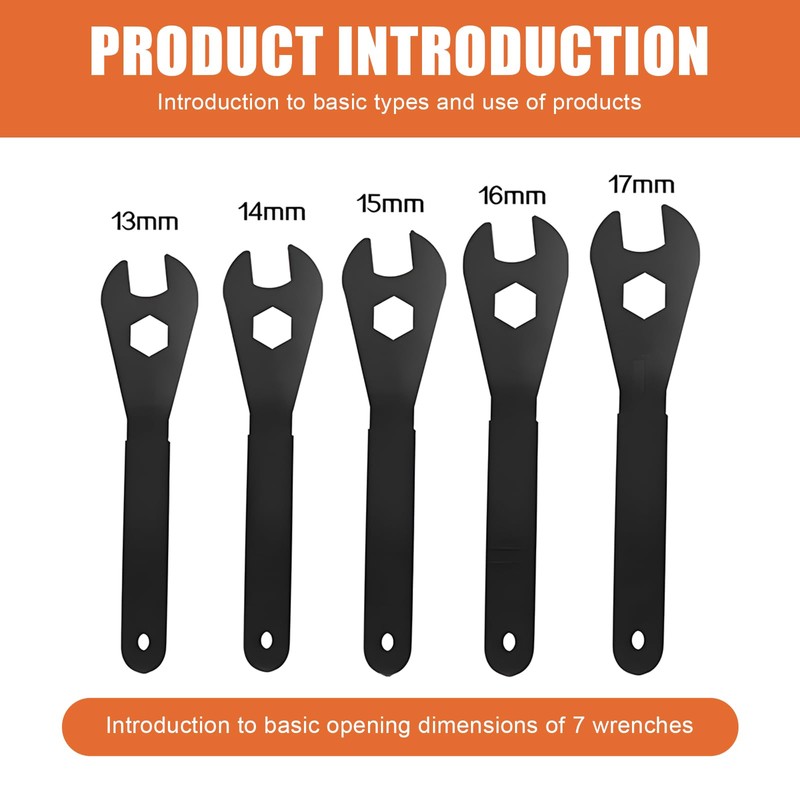 - Box contents: the cone wrench set contains 5 cone keys in sizes 13 mm, 14 mm, 15 mm, 16 mm and 17 mm. Specifically designed for adjusting tapered hubs on bikes, this wrench is an essential tool for any serious cyclist and is an optimal addition to any tool collection.