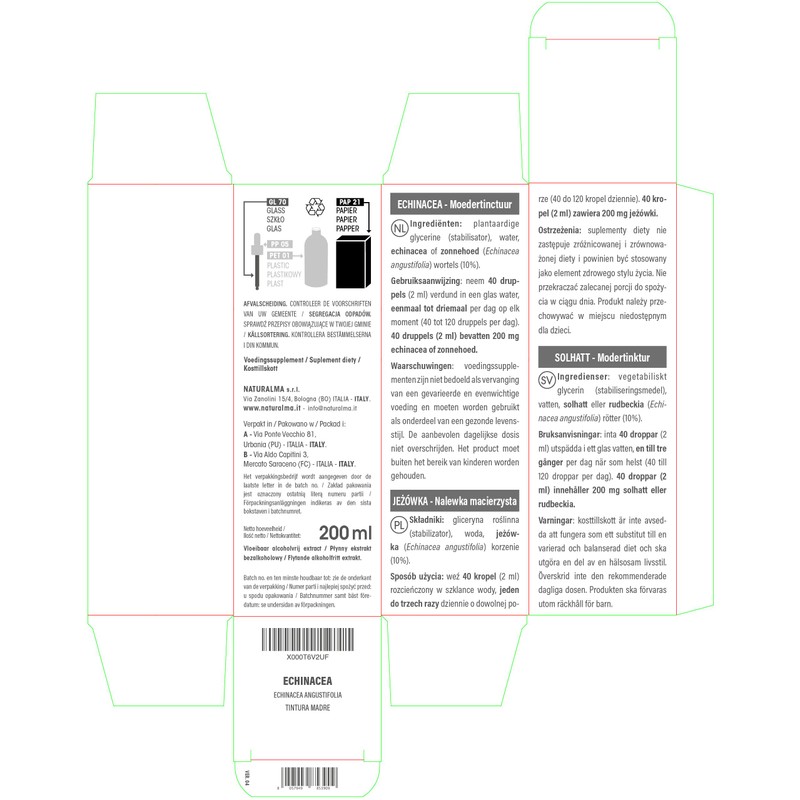 Dietary supplement as a mother tincture in teardrop form based on coneflower (Echinacea angustifolia) root extract, concentrated (1:10) and very pure, 100% natural. All Naturalma original tinctures are made using an exclusive extraction method that allows you to achieve the maximum concentration of active ingredients. They are 100% alcohol-free and completely natural and have a pleasant taste without added sugar, suitable for children and pregnant women. Dietary supplement made and packaged in Italy and registered with the Italian Ministry of Health. Glycerine is a sweetener of plant origin and 100% natural and low in calories. Glyceric macerate or pure liquid extract of coneflower (Echinacea angustifolia) roots in drops. Naturalma recreates its look, with colourful and attractive packaging: The packaging is now available in a new graphic layout. As with all changes, there will be a small transitional period in which the "old" packaging can still be shipped. Don't worry! Contents and quality of the dietary supplements contained in it remain unchanged.