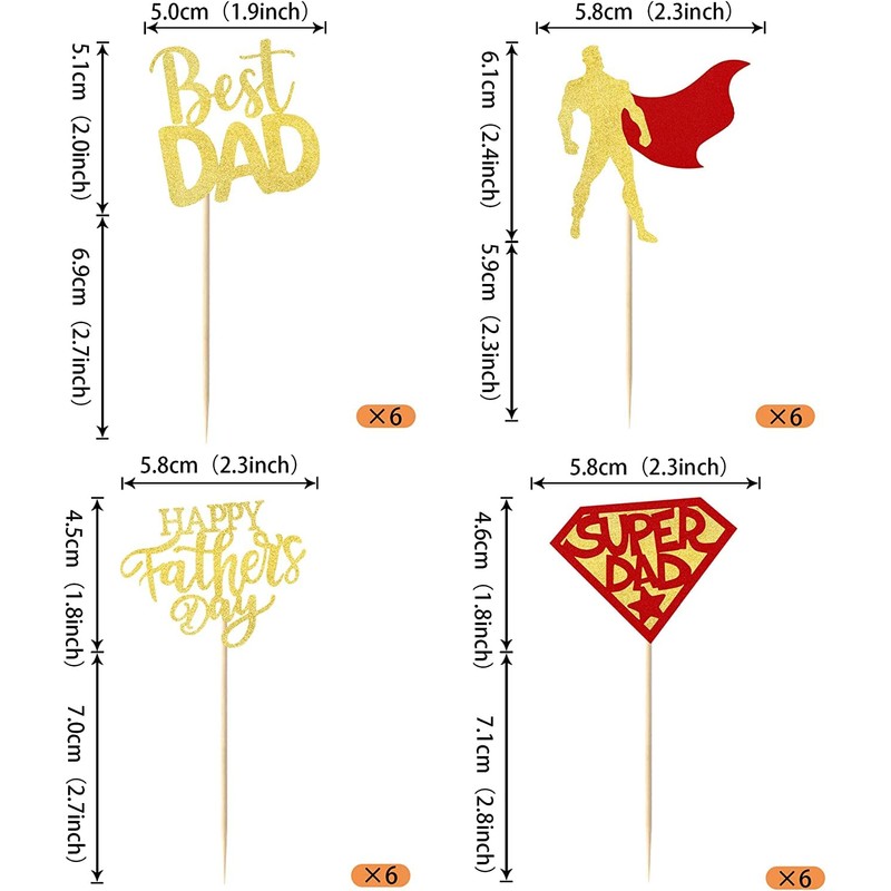- 🦸 Pack of 24 cupcake toppers with 4 unique designs (6 pieces each), including "Best Dad", "Super Hero", "Happy Father's Day", and "Super Dad"