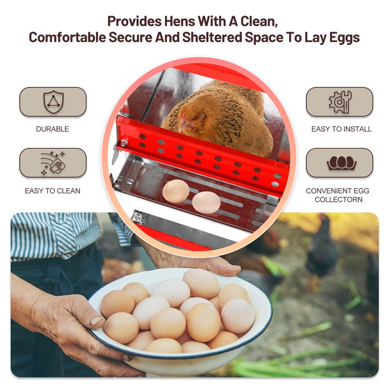 - CONVENIENT EGG COLLECTOR: Provide your chickens with a safe and comfortable place to lay their eggs, the one-piece nesting boxes for chickens simply opens the lid and collects all the eggs, no need to worry about the eggs being crushed or stolen by wildlifes.