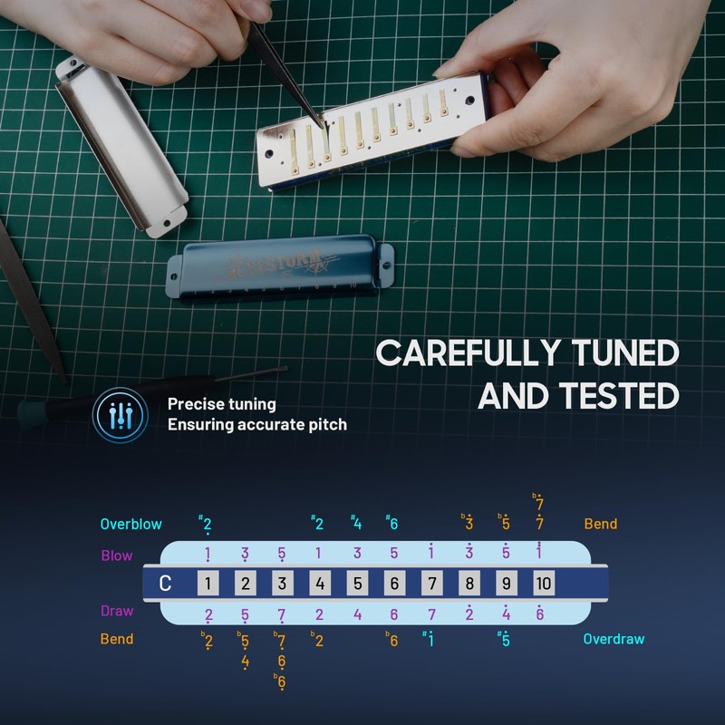 • For all novices, whether adults or kids, the CONJURER Blues 10 hole 20 tone diatonic harmonica is a good choice. Each harmonica is made with a cover plate made of food-grade stainless steel and ABS resin to assure its quality and safety. A cleaning cloth and an instruction booklet are included in the protective case that matches each harmonica. Anyone who wants to learn how to play the harmonica would love receiving this as a present.