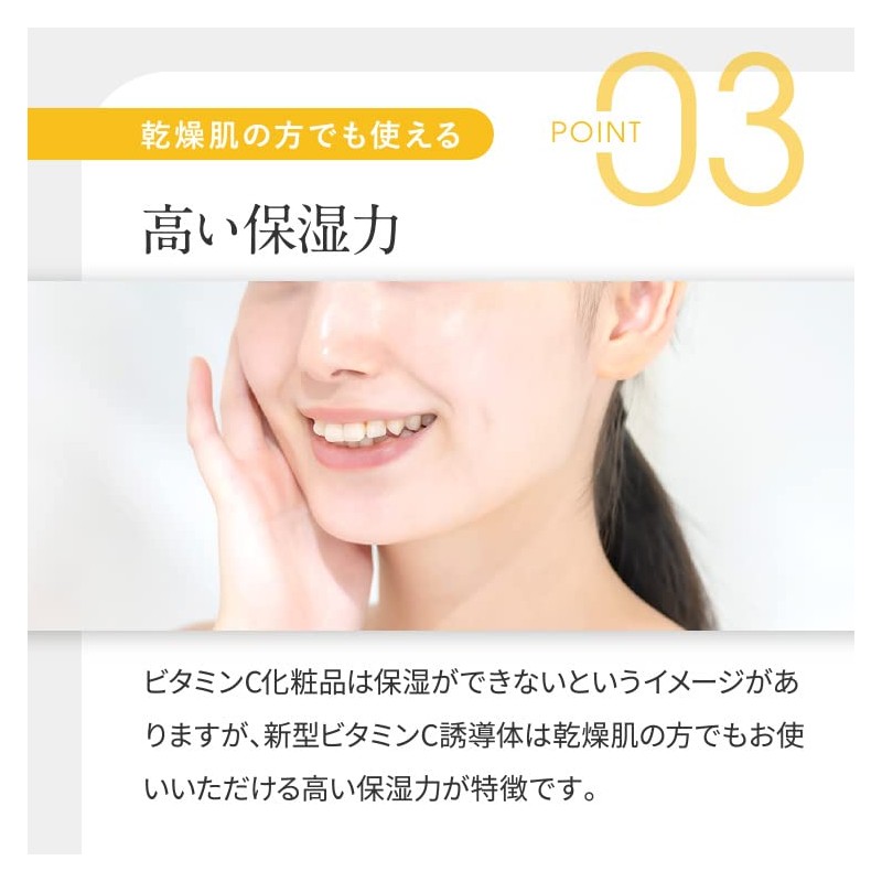 - Point 03: Can be used even for those with dry skin: Vitamin C cosmetic products are impossible to moisturize them, but the new Vitamin C derivative has a high moisture retention power that can be used even by people with dry skin. | Non-sticky, moist after application The slightly tender texture makes it easy to stretch and apply even a small amount