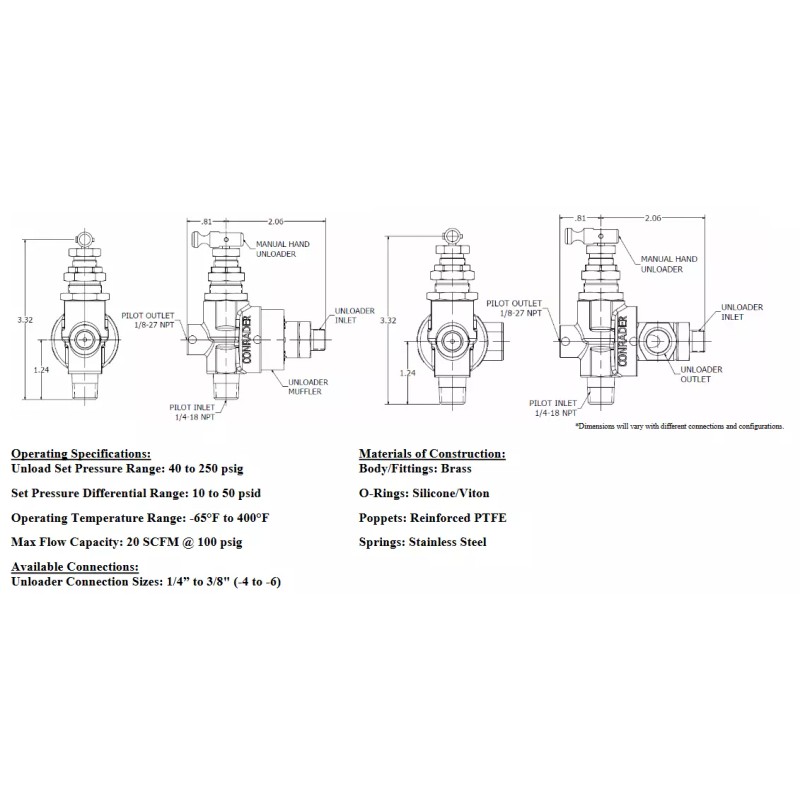 Operating Temperature Range: -15° to 400°F Max Flow Rating: 20 SCFM Piloted unloader valves are used in constant speed applications where there are no intake unloaders present. They incorporate a discharge unloader on the body of a pilot valve to allow one valve to sense system pressure and vent discharge air to atmosphere. At load pressure, the pilot valve closes the discharge unloader and the compressor returns to normal operation.