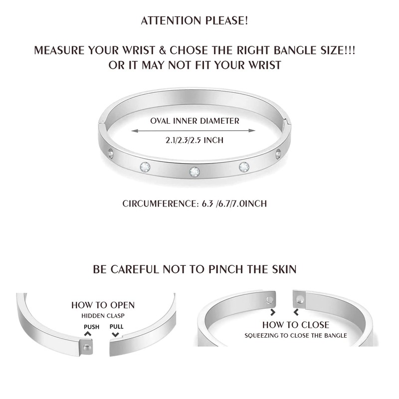 - Clasp: The Bangle With Hidden Clasp Is Simple And Elegant And Very Easy To Get On /off For Adults. Insert Your Index Finger And Pull The Top Part And Use Your Thumb To Push The Bottom Part. For A Better Understanding Of The Usage, The User Manual With Exact Details Would Be Attached In The Package.affordable Price With Exquisite Quality, High Polished Bracelet, Shinne Surface, Very Smooth With Rounded Edges To Avoid Scratch Your Wrist, Clear Engraved Easily Reading.