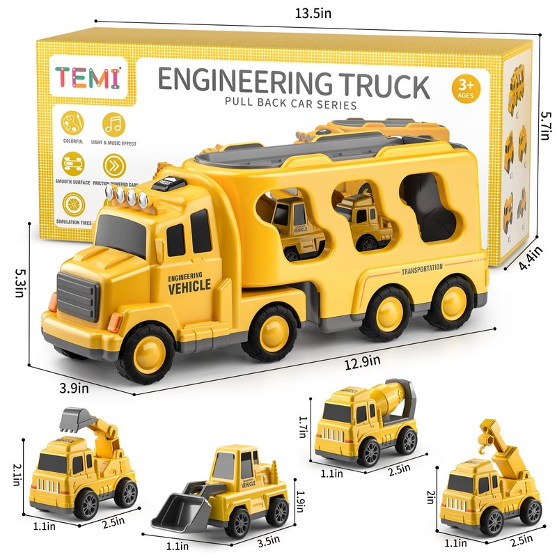 - CONSTRUCTION SET - This construction transport truck toy includes a larger transport truck and 6 realistic mini engineer vehicles -excavator, drill, mixer, 2 crane and dump. Simulated toy cars arouse kid's curiosity and make games time for toddler age 3-4.