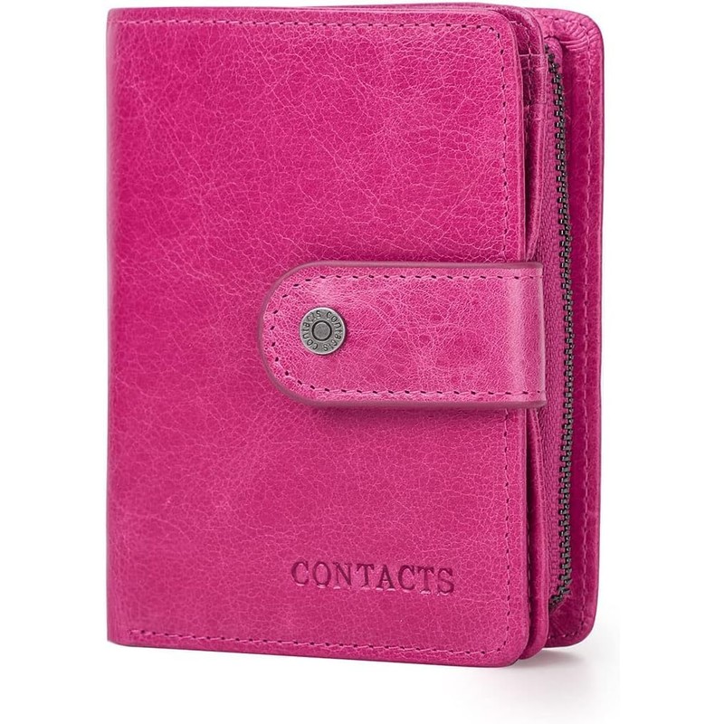 [Contact's serie] Women's Wallet, Genuine Leather Bifold Wallet, Small Mini Zipper Coin Purse, 12 Slots Card Holder, Travel RFID Wallet, Rose red