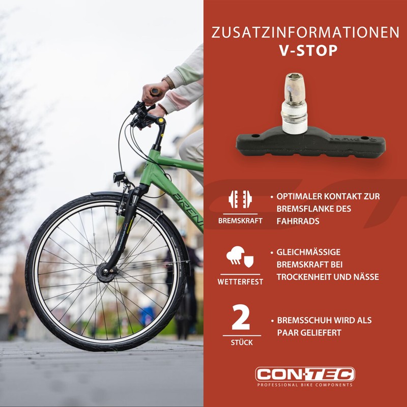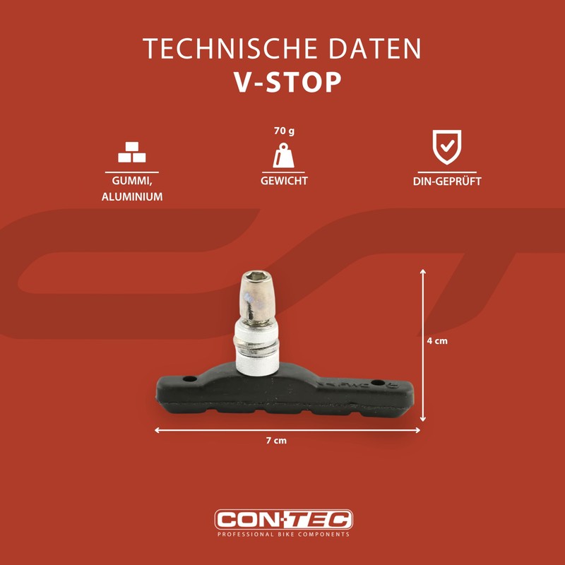 - Optimal deceleration: the CONTEC V-Stop brake shoe offers excellent braking performance thanks to its medium-hard rubber compound and at the same time reduces wear - for reliable deceleration