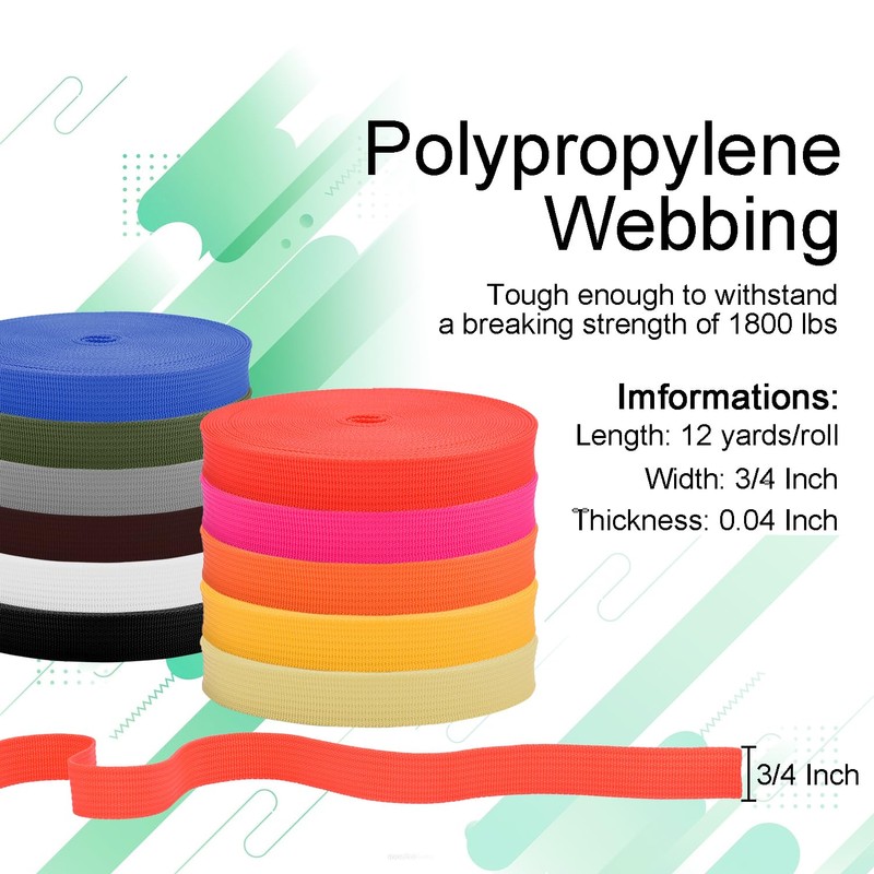 - 【Heavy duty Polypropylene strap】 Poly webbing strap 3/4 Inch wide, 0.04 inch thickness . 12 yards a roll and 11 colors.Made with a tight weave,durable, strength,tear-resistant.Suitable for prolonged outdoor use.
