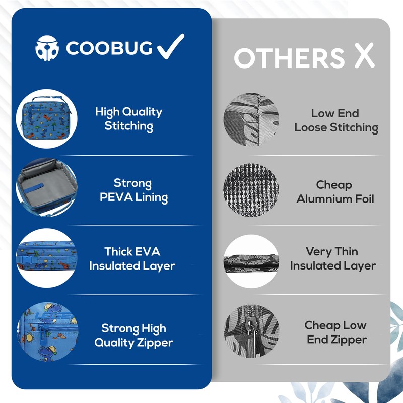 - LIGHTWEIGHT & DURABLE - Built for the hustle of school life and outdoor adventures, our COOBUG Kids Lunch Bag is crafted from high-quality materials and certified to meet CPSIA standards, ensuring durability and safety for use by children. Despite its robust construction, the lunch box remains lightweight, making it easy for children to carry. Experience the perfect combination of durability and convenience with our lunchbag that effortlessly withstands daily wear and tear.