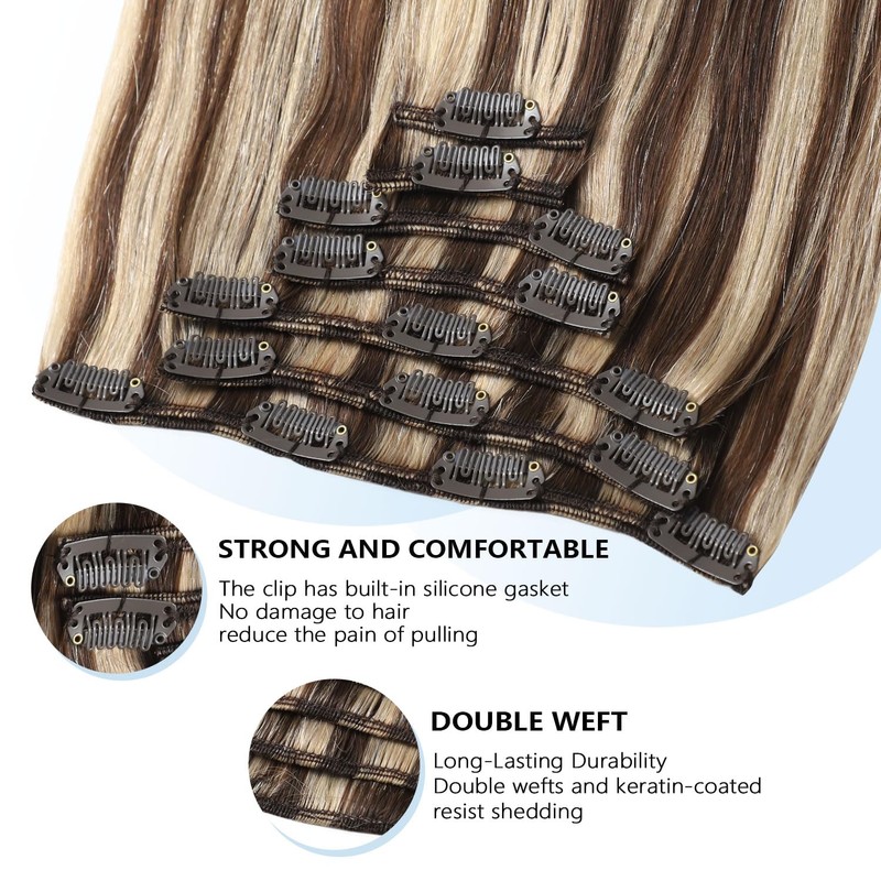 COOKAYU Clip in Hair Extensions Real Human Hair, 22inch 120g 7pcs Natural Human Hair Extensions Clip in Human Hair, 4P27 Medium Brown and Caramel Blonde