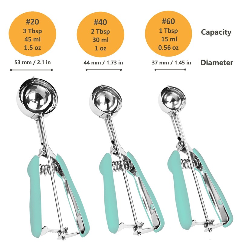 - 3 SIZES, MULTIPLE USES. The cookie scoop set includes: Small cookie scoop, #60 scoop (1 Tbsp/15ml/0.5 oz), Medium cookie scoop, #40 scoop, (2 Tbsp/30ml/1 oz), Large cookie dough scoop, #20 scoop, (3 Tbsp/45ml/1.5 oz). They can be ice cream scooper, cookie scooper, cupcake scoop, meatball scoop, melon baller scoop, measure spoon. You can use the cookie scoops easily to create different size balls of ice cream, cookie dough, muffin, meatballs, mashed potatoes, melon and other fruits sorbet.