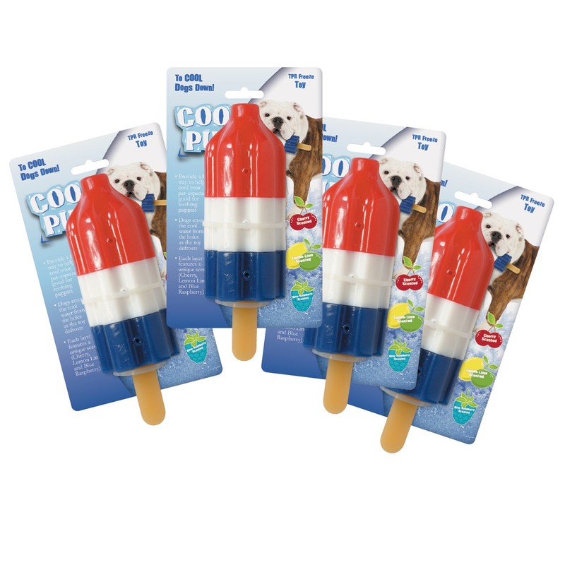 Cool Pup Rocket Pop Toy Packs are available in 4-Packs and 12-Packs. Fill with water and freeze—water will defrost and escape through the small holes, offering a satisfying chew and a refreshing drink at the same time Perfect for teething puppies Each layer features a unique scent (Cherry, Lemon Lime, and Blue Raspberry) Fun rocket pop shapes are perfect for hot days Material: Thermoplastic rubber (TPR)Size: Each measures 7¼"Care: Wipe clean with a damp cloth.