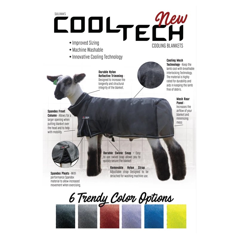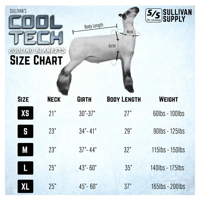The Cool Tech Blankets are designed with innovative cooling technology. The material is designed to keep the lamb or goat cool with breathable interlocking material. The material is highly rated for durability and aids in keeping the lamb free of debris. It also acts as a protective shield, equipped with a anti-mosquito barrier with anti-UV protection. The blankets have improved sizing that allows for a up to date comfort fit. Newly added performance features consist of the Spandex Pleat Designed to allow increased movement when exercising, and also the Spandex Front Column Designed to allow for a larger opening when putting on the blanket over the head. Machine Washable Innovative Cooling Technology Small – (90lbs – 125lbs) – 29.5” Long, 16.5” Deep, 11” Neck