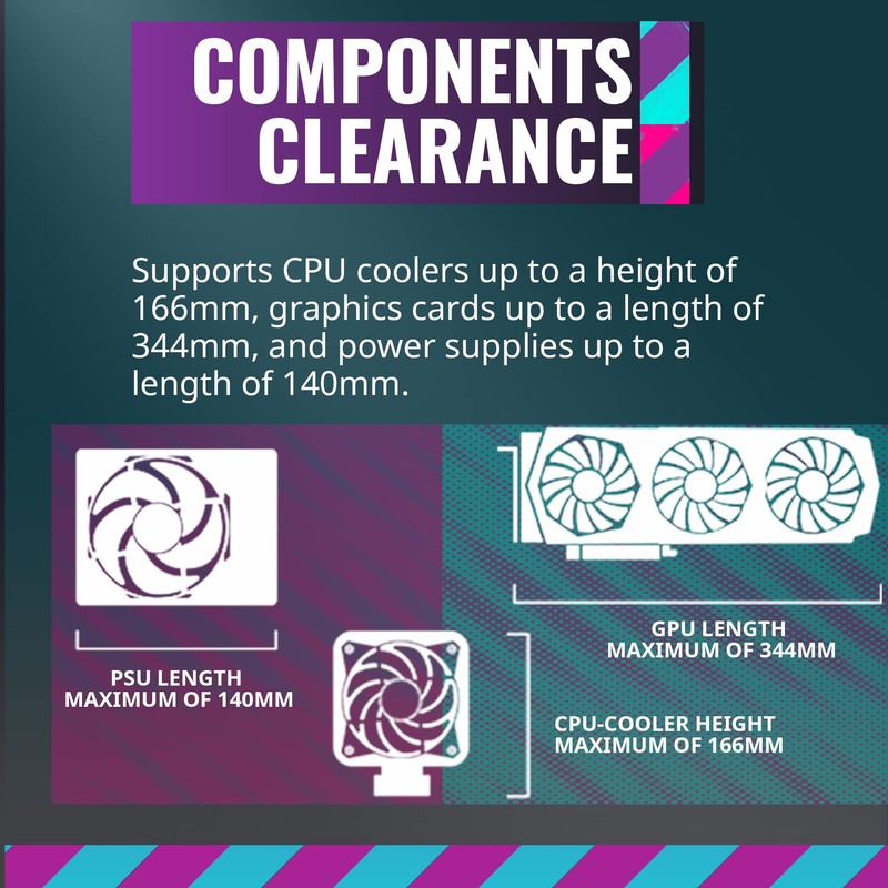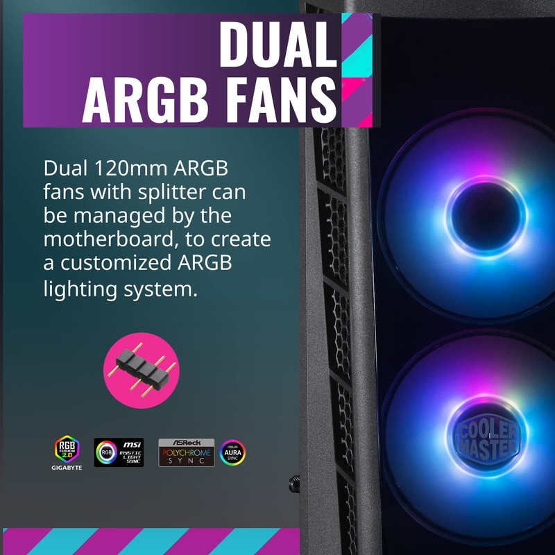 - Dual ARGB fans 2 pre-installed 120 millimeter ARGB fans can be managed by the motherboard connected by the included splitter to create a comprehensive ARGB lighting system