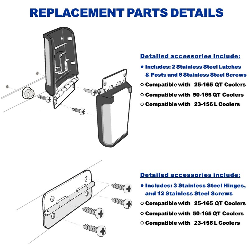 - PACK ALL PARTS: Cooler Stainless Steel Hinge and Latch Set, Which Contains 3 Stainless Steel Hinges, 2 Stainless Steel Latches, 18 Stainless Steel Screws, and 1 Reusable Packaging