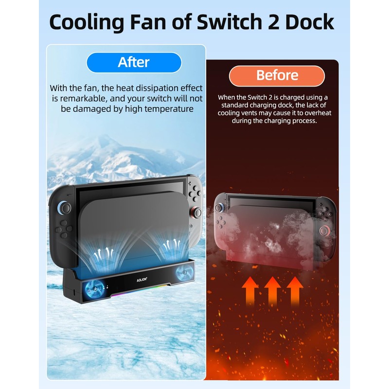 • 【Cooling Dock Station for Switch 2】Advanced cooling fan system designed specifically for Nintendo Switch 2, helping maintain optimal temperature during extended gaming sessions