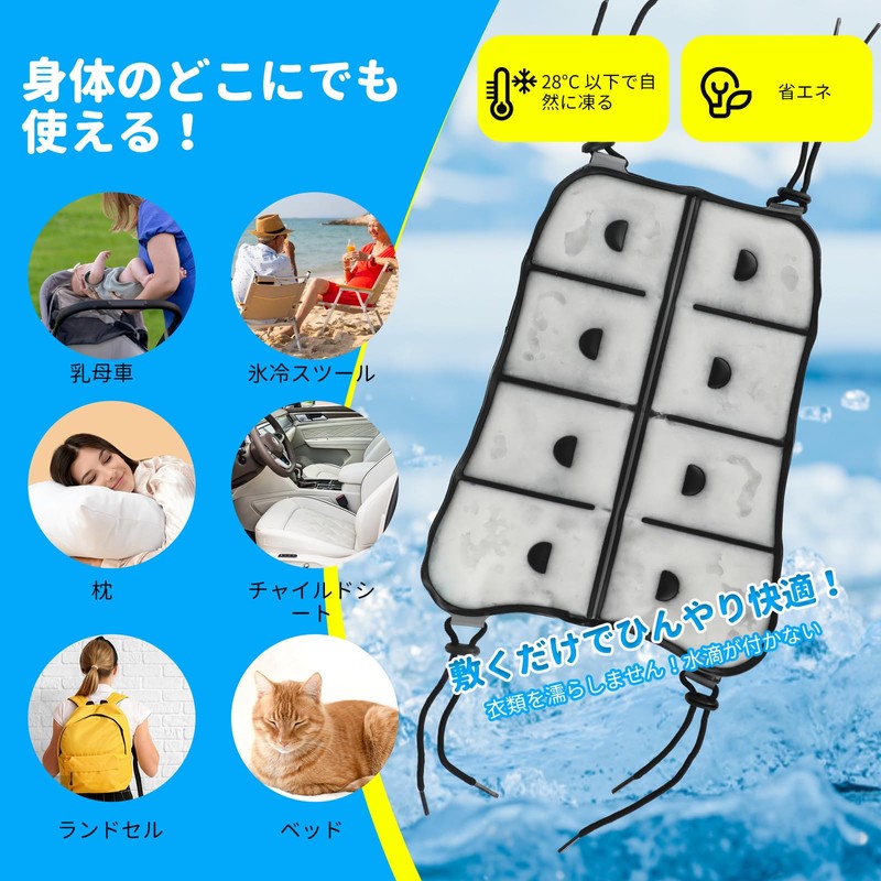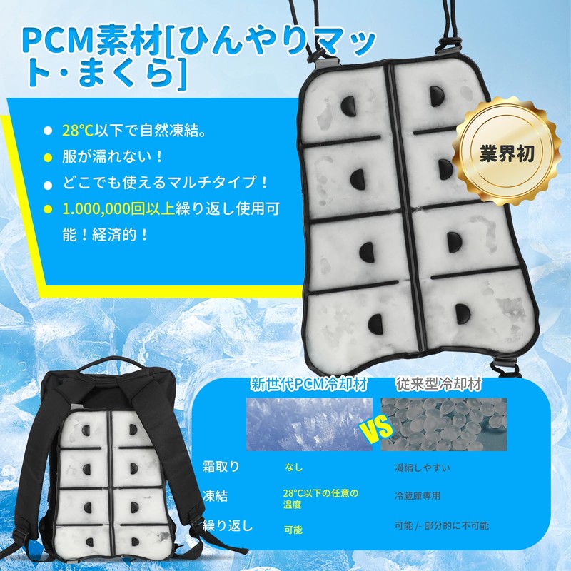 - (Can be used repeatedly) The specific gravity is about 30% lower than water, so it is light. Does not use external energy such as electricity. You can use it over and over again for a long period of time as you just need to repeat the phase changes of melting and solidifying substances. A back cooling seat for a backpack that cools your back even when you carry a rucksack. For preventing stuffiness and heat from rucksack. Just attach it to your backpack to make your back comfortable