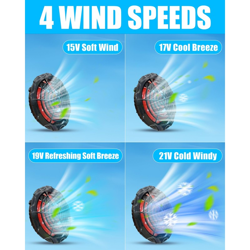 - đ§ăTHREE-SPEED WIND ADJUSTMENT/UNRESTRICTED MOVEMENTăThe cooling vest fan has 4 adjustable wind speeds, allowing you to freely choose from 21v/19v/17v/15v speeds. The fan is lightweight, so you won't feel any pressure on your body. Since it is vest-style, it won't restrict movement, providing comfortable wear. You can also use it in the office since the fan won't impact the backrest when seated, and it can function normally.