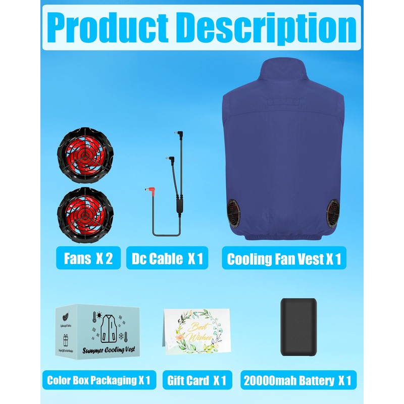 - đ§ăCOMPLETE SET OF COOLING FAN VEST + PEACE OF MIND 1-YEAR WARRANTYăCooling fan vest x 1, 20000mAh battery x 1, fan unit x 2, USB cable x 1, user manual x 1. †We offer a 1-year warranty for customers to make a worry-free purchase. Note: Due to manual measurement, there may be an error of 1-2 cm. Sizes vary by body type, so please refer to the size chart in the images before ordering. In case of any product issues, please contact us through "Order History" -> "Contact Seller."