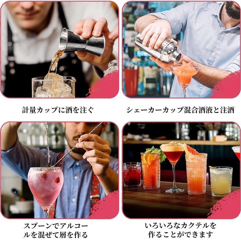 【Shaker Cocktail Includes】1.550ml shaker cup made of premium 304 stainless steel, mirror polished, smooth touch, elegant and stylish. The built-in filter on the top simplifies the process of making cocktails, ensuring smooth pouring of drinks and avoiding impurities. 2. Jigger cup: Double-sided tape measuring 30ml/45ml, 304 stainless steel material, accurately measure the alcohol ingredients you need, making cocktails more accurate and ensure the taste of match. 1.2 inch (3.30 cm) stainless steel spoon, selected 304 stainless steel material, streamlined design, rounded and smooth, practicality and aesthetic. Multi-functional: This shaker cocktail can be used for a variety of needs, including classic Martinis, margaritas, and innovative cocktails. Not only do you try different recipes but also improve your liquor coordination skills and bring an amazing drinking experience to friends and family. 【Widely Used】This shaker cocktail is perfect for bar, transparent bar, family, restaurant, hotel milk tea shop, etc. Suitable for bartenders, liquor enthusiasts and beginner drinking. It provides a professional matching tool for various cocktail enthusiasts and makes it easy to make a variety of cocktails and beverages. This shaker cocktail has a high quality, easy to use and multifunctional design, suitable for home as well as professional drinking environment. Whether you are a beginner or a seasoned who wants to improve their skills, this set will become an indispensable assistant.