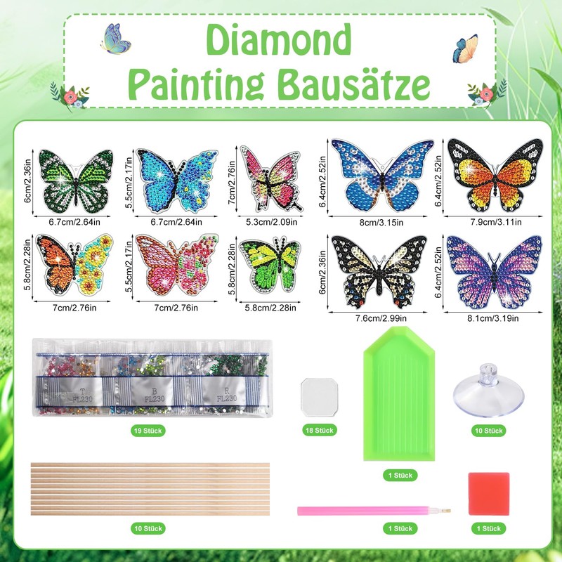 - Package contents: the diamond art set contains 10 pieces butterfly diamonds, 10 pieces 31 cm long bamboo sticks, 10 pieces suction cups and 18 pieces double-sided stickers, 1 piece diamond pen, 1 piece clay glue and 19 packs of colourful diamonds