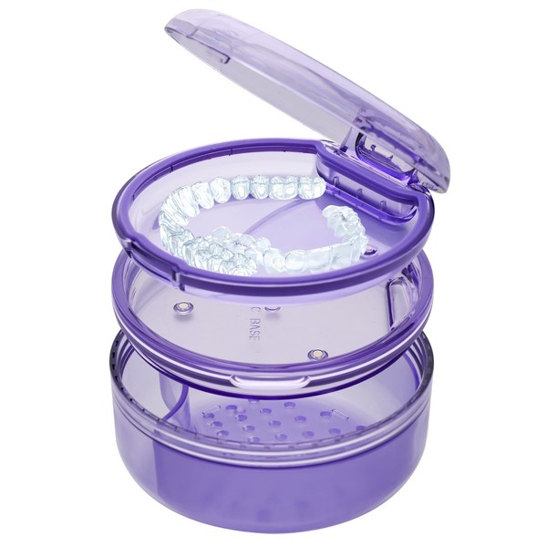Coolrunner 2-in-1 Retainer Case Denture Case Retainer Cleaning Case, Denture Cup with Strainer, Leak Proof Denture Cup Soaking Holder for Dentures, Mouth Guard, Night Guard & Retainers (Purple)