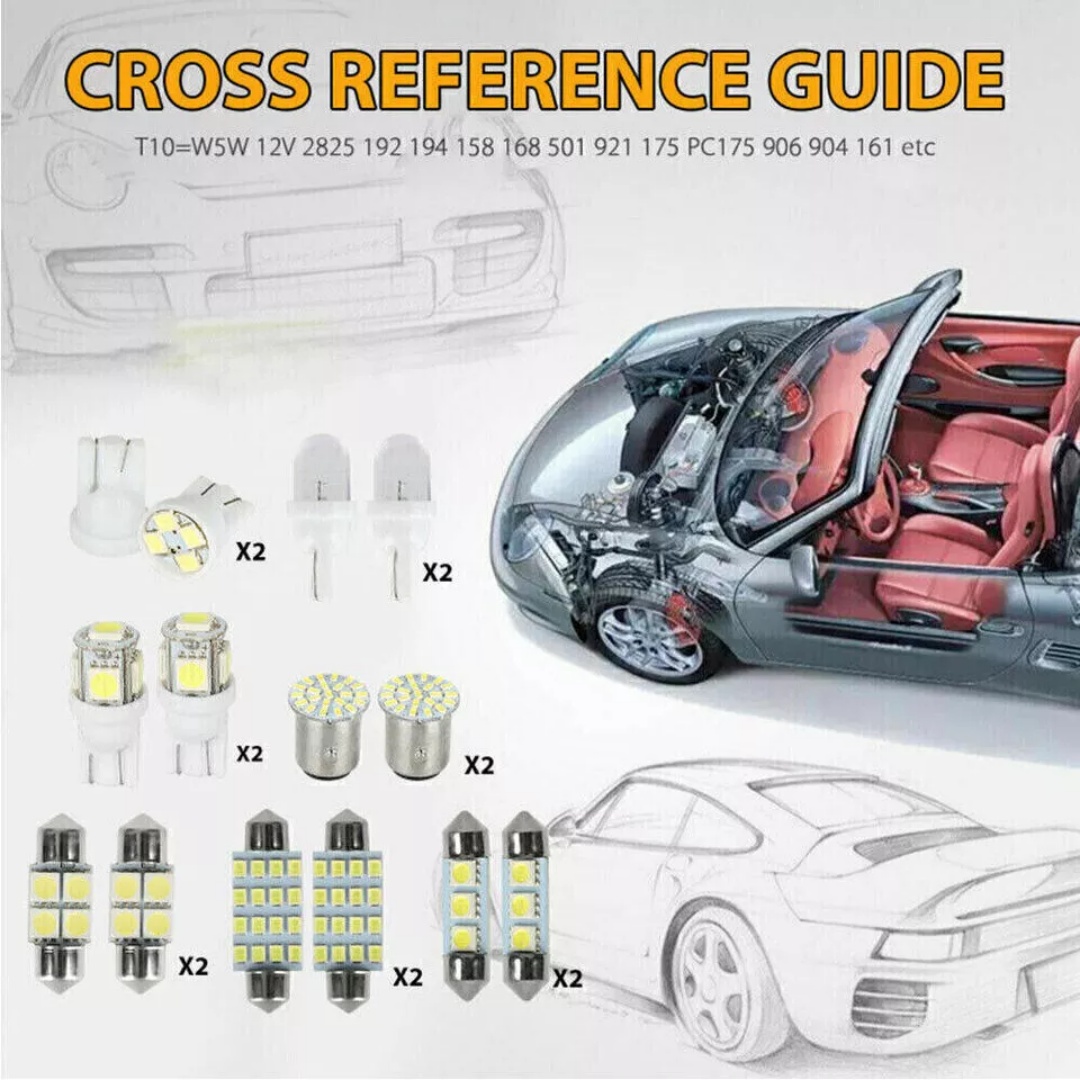 This Interior xenon white LED Kit Will Include the Following bulbs for applications around the interior of your vehicle, such as Dome, Map, Door, Glove Box, License Plates Etc.